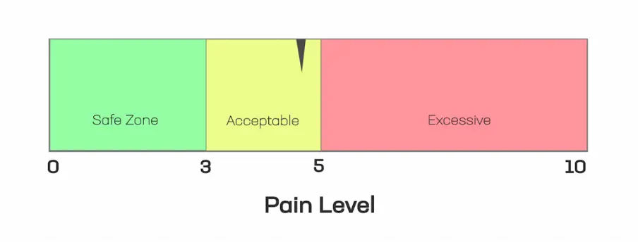 - A little bit of pain when loading the tendon (maximum 3/10 pain) is considered good and normal – just enough pain to allow for good healing but not enough pain to make things worse.