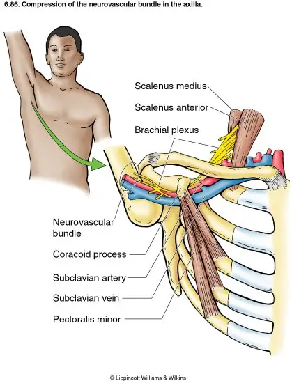 It is a compression of the neural (maybe also the vascular) structures which exit from the neck and down the arm. Due to other underlying factors there are 2 bones which sandwich the nerve structures exiting your neck. This leads to those nerves being irritated and you feeling those symptoms.